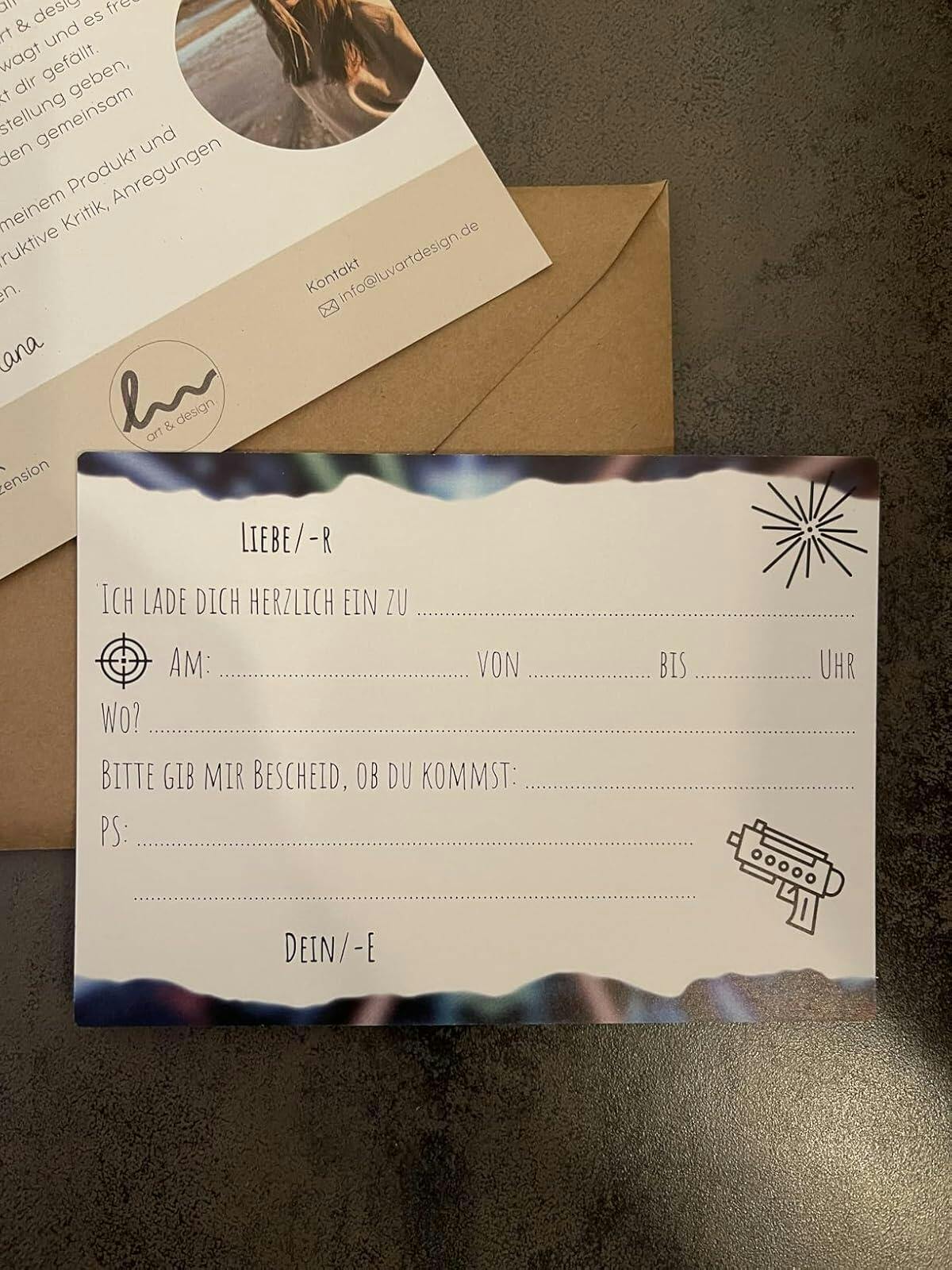 12x Kindergeburtstag Einladungskarten mit Lasertag Motiv (+ Briefumschläge)