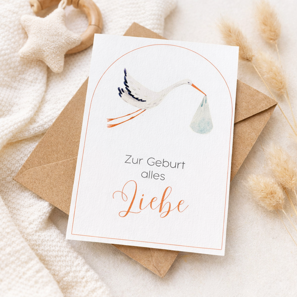 Mit dieser liebevoll gestalteten Grußkarte kannst du deine Glückwünsche stilvoll überbringen und frischgebackenen Eltern eine besondere Freude bereiten.