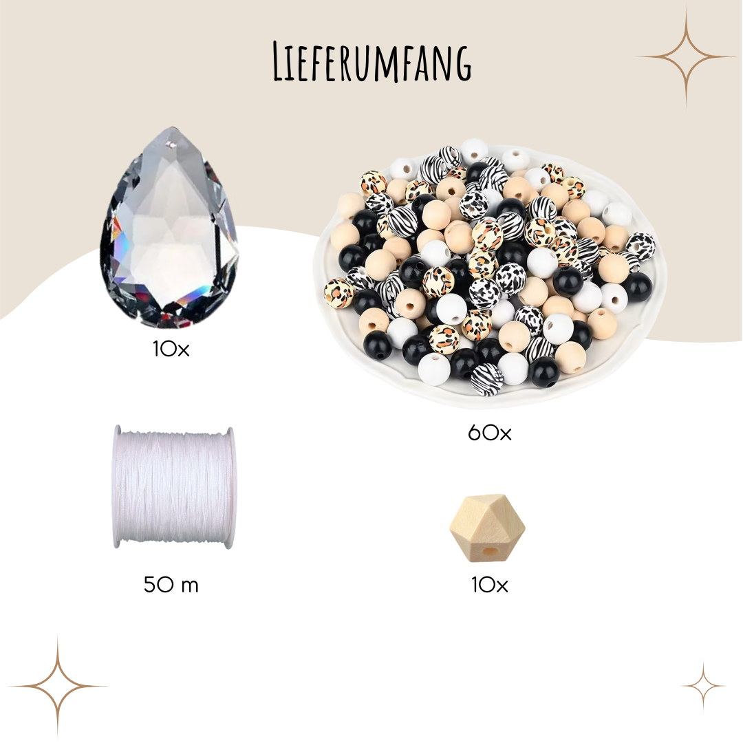 Das Bastelset enthält alles, was du brauchst, um bis zu zehn individuelle Sonnenfänger zu gestalten: 10 hochwertige Kristalle in Tropfenform (38 mm), 70 naturbelassene und gemusterte Holzperlen sowie einen 50 Meter langen, reißfesten Faden, den du flexibel zuschneiden kannst. Ganz egal wie du die Perlen kombinierst - jedes Design wird zum Einzelstück.